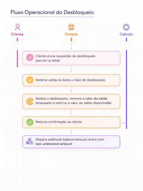 A API de Desbloqueio de Saldo permite realizar a liberação total ou parcial de valores previamente bloqueados na conta do cliente, transferindo o montante desbloqueado do saldo bloqueado para o saldo disponível.