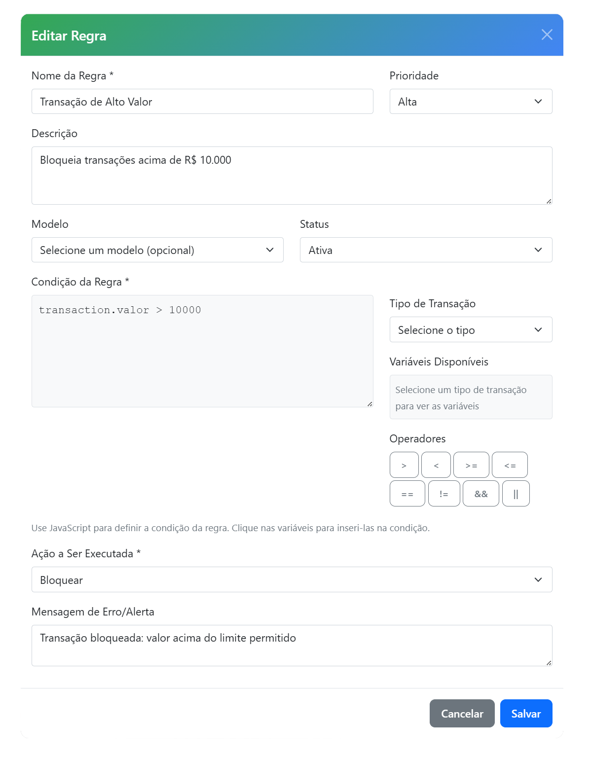 Com os operadores disponíveis, você pode criar regras lógicas com os campos e valores de acordo com a sua operação.