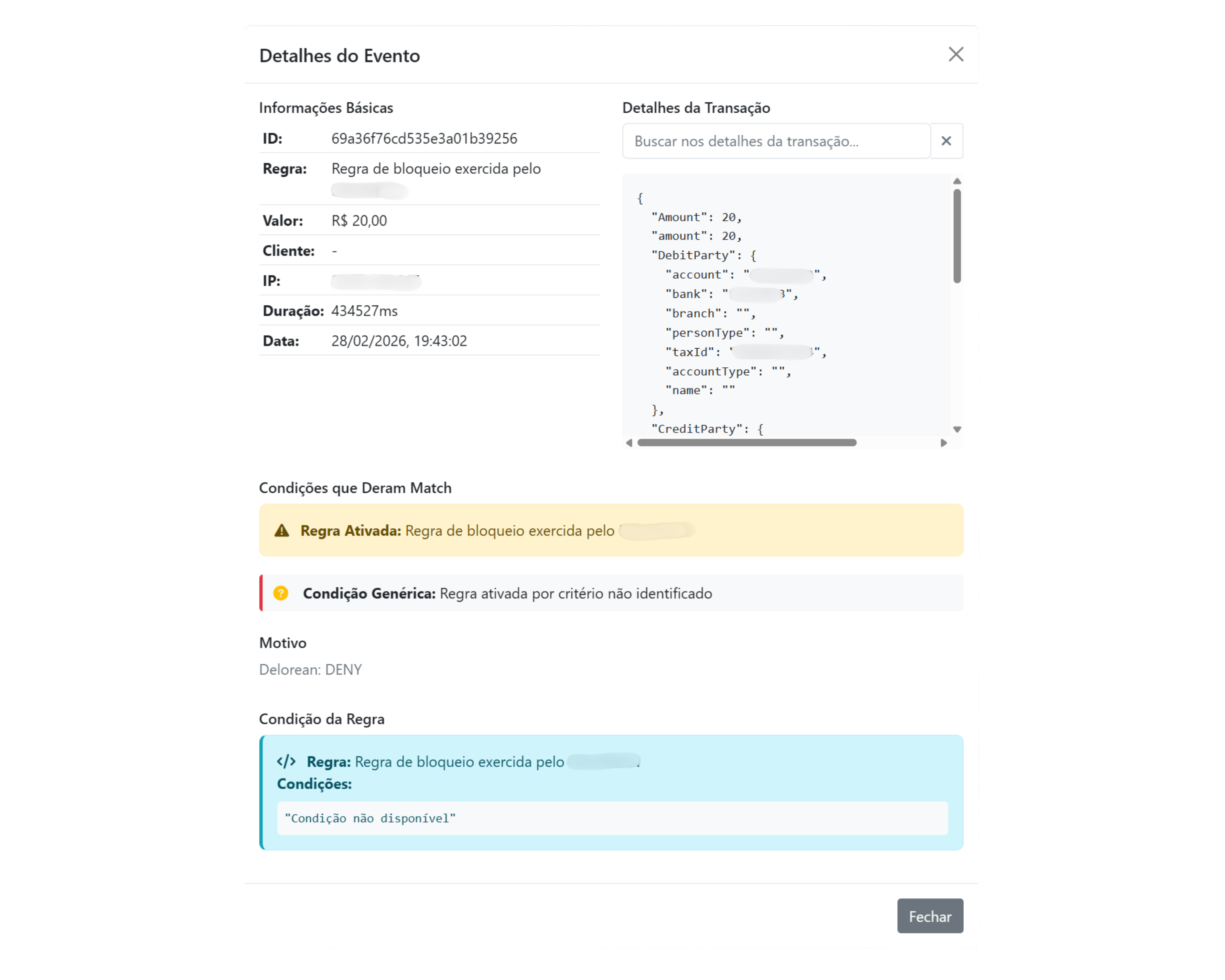 Todos os tipos de transações e seus campos são automaticamente mapeados de acordo com o tipo da transação (ex: Pix In, Pix Out) e estão disponíveis para criar as regras.