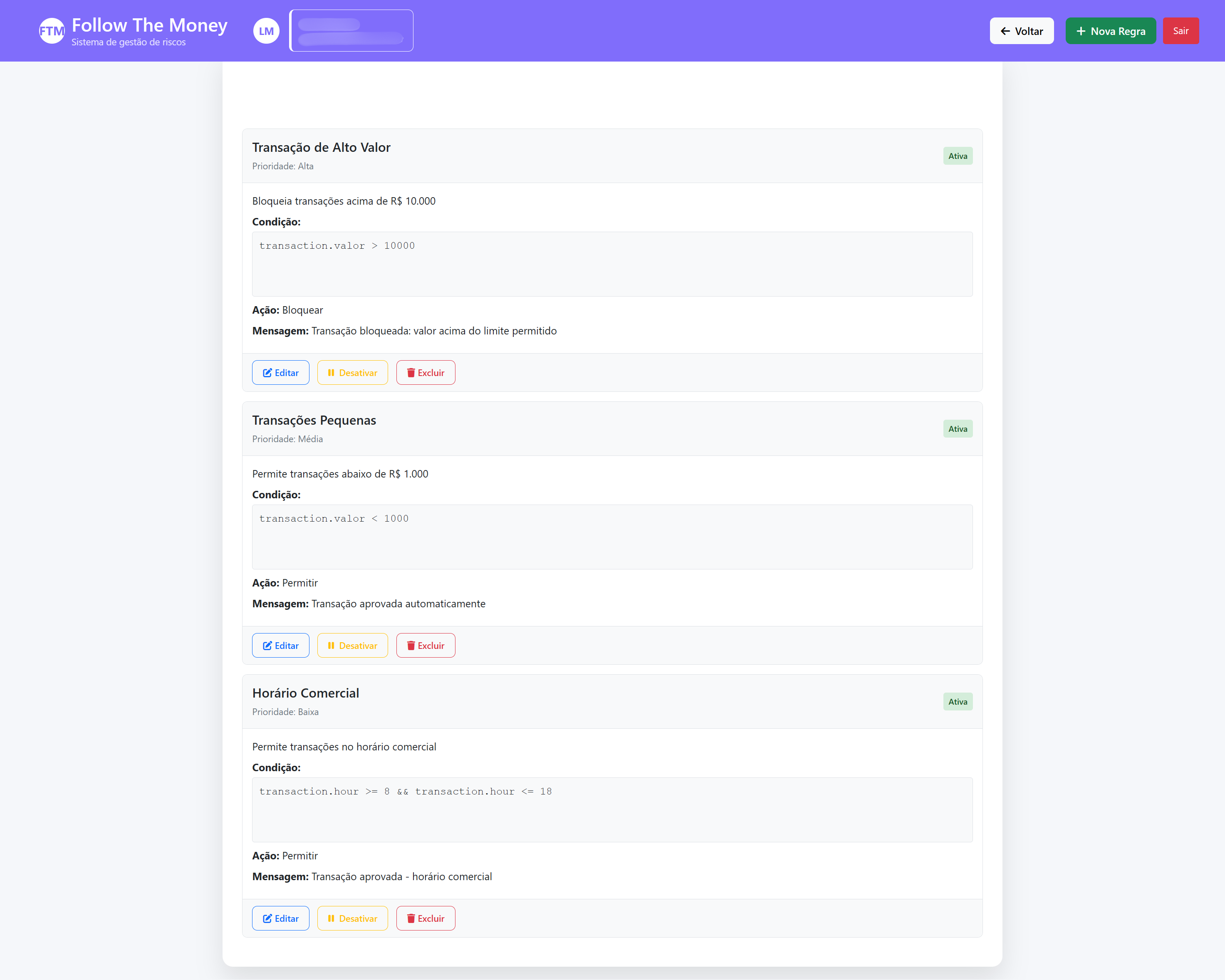 Atenção: ao criar regras, é importante verificar a sobreposição de parâmetros que podem ser conflitantes.