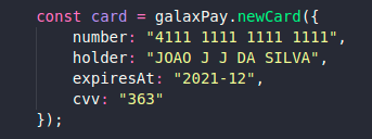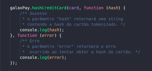 - É importante garantir que os dados do cartão (número, CVV, expiração e nome do portador) não serão enviados em texto plano para o seu servidor, trafegando apenas a hash gerada.