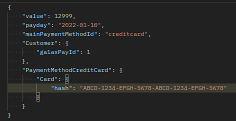 - Enviar a hash ao realizar a cobrança: Nos endpoints da API v2 de Criar Assinatura/Contrato e Criar Cobrança Avulsa Informar dentro do nó PaymentMethodCreditCard.Card a hash obtida pelo JS da seguinte maneira: